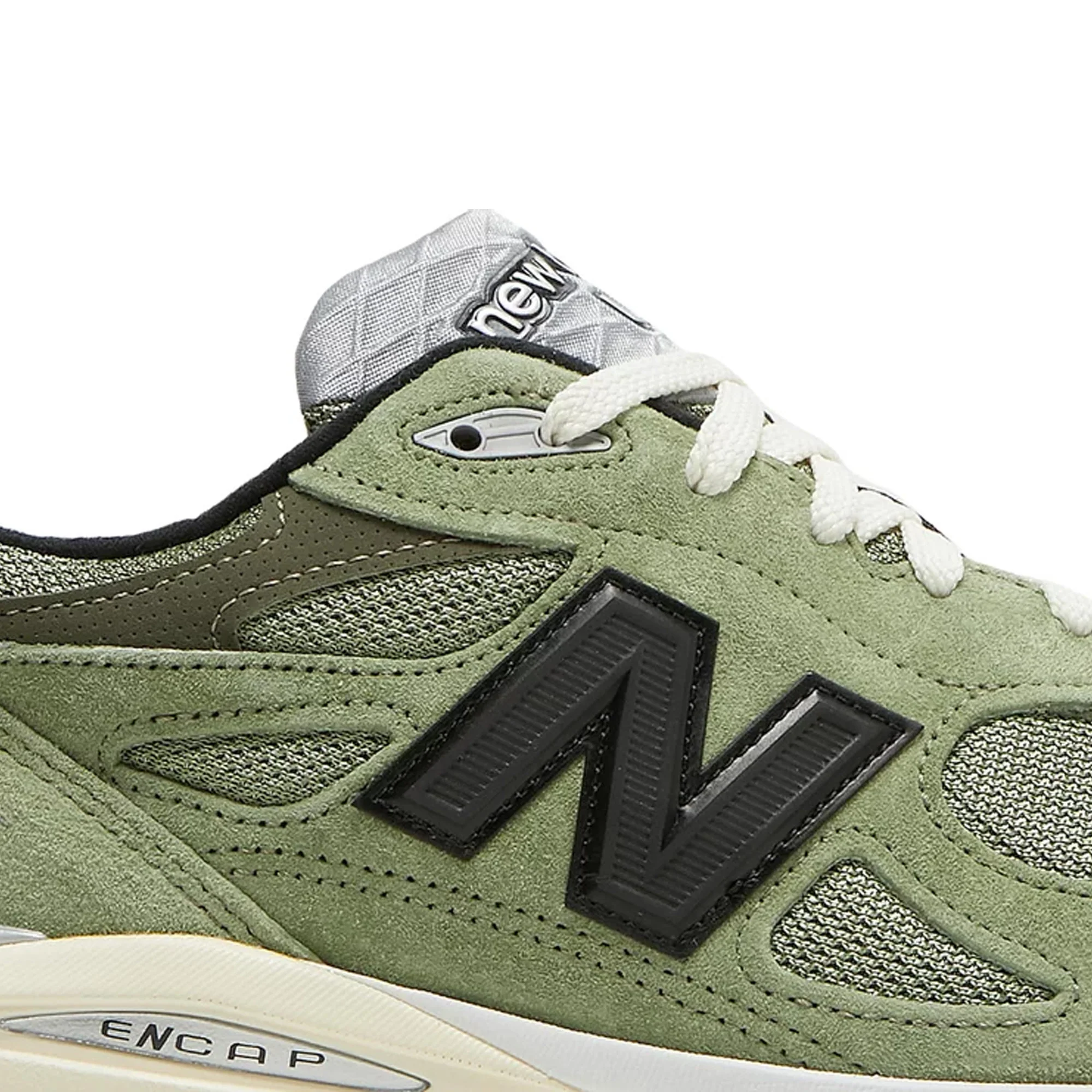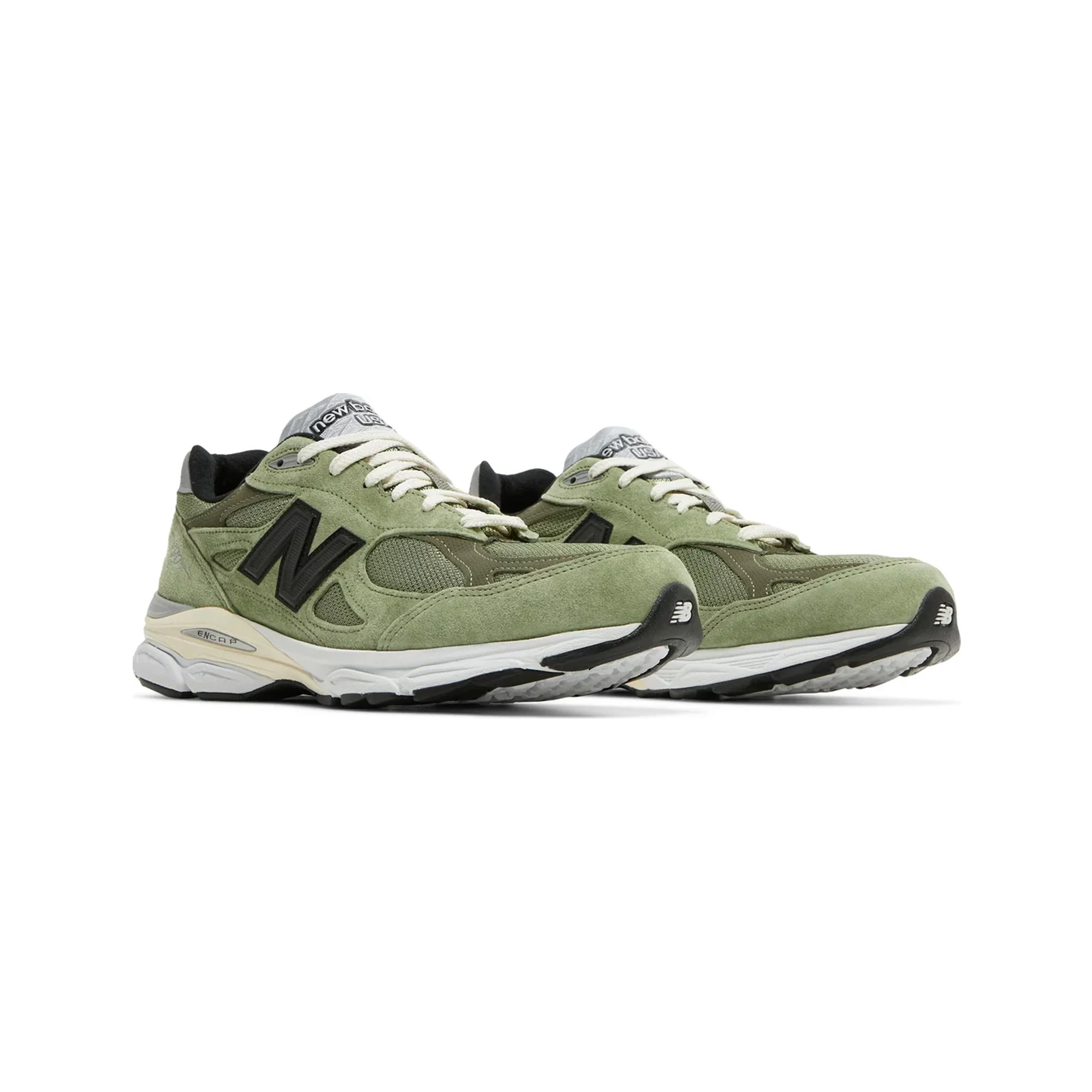 The New Balance 990v3 JJJJound Olive adopts a minimalist design strategy to create a shoe designed for everyday wear. It comes with olive mesh and quality suede uppers. The tone green base is sharply contrasted by the black New Balance emblems and overlays. A personalized touch is provided with a silver reflective heel wrap with JJJJound logo. The design is then finished off with a cream ENCAP sole at the base.
