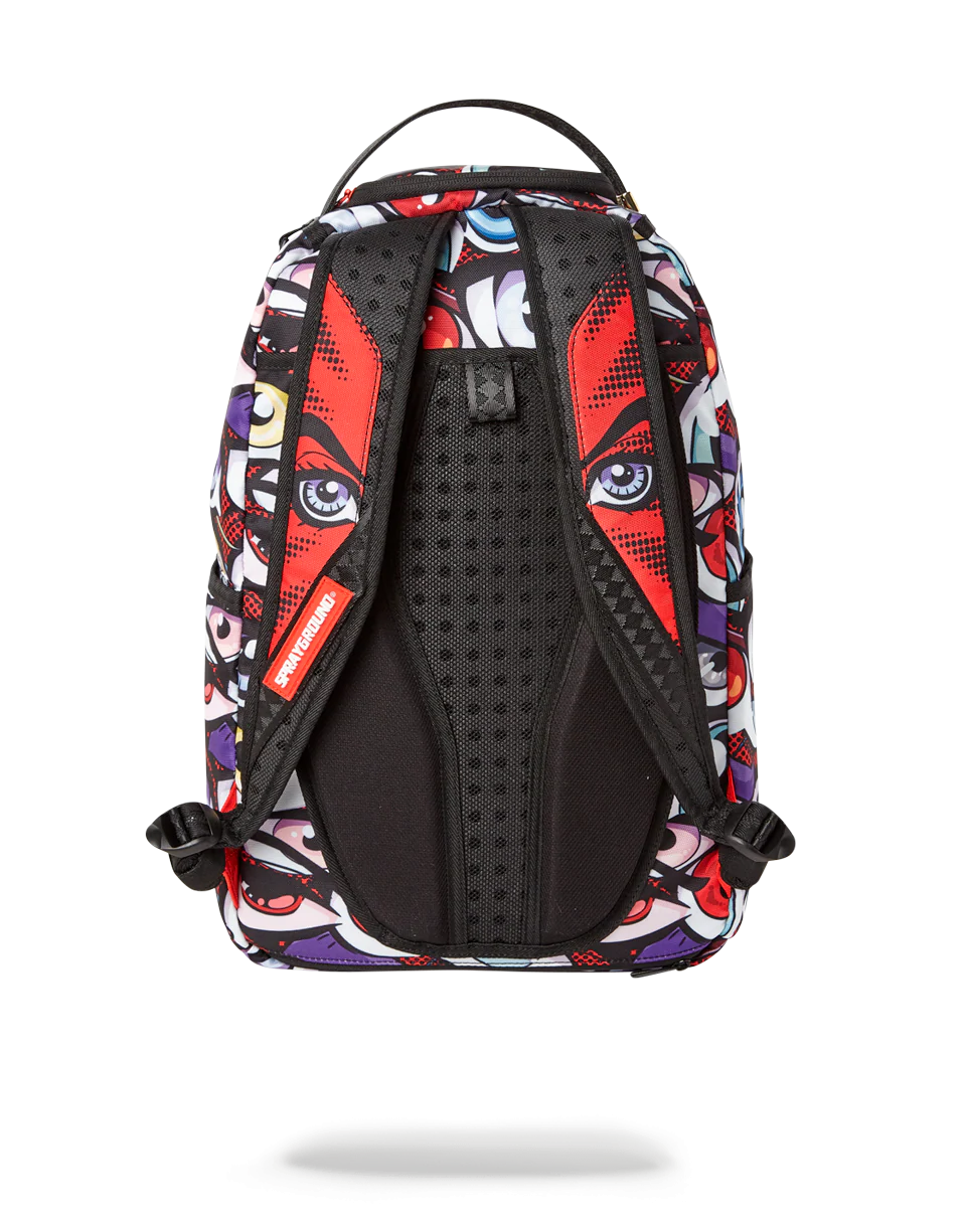 ExteriorDimensions: 18" x 6" x 11.5" • Front zipper pocket • Side pockets • Zippered Stash pocket • Separate velour sunglass compartment • Ergonomic mesh back padding • Adjustable Straps for custom sizing • Red zippers with metal hardware • Metal "Sprayground Authentic" badge • Slide through back sleeve connects to carry-on luggage to free your hands