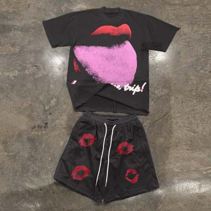 Casual personality street style retro lip print shorts suit