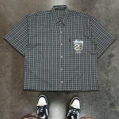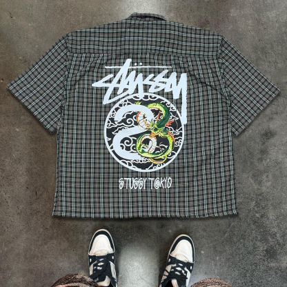 Fashion Dragon Plaid Print Button Short Sleeve Shirt