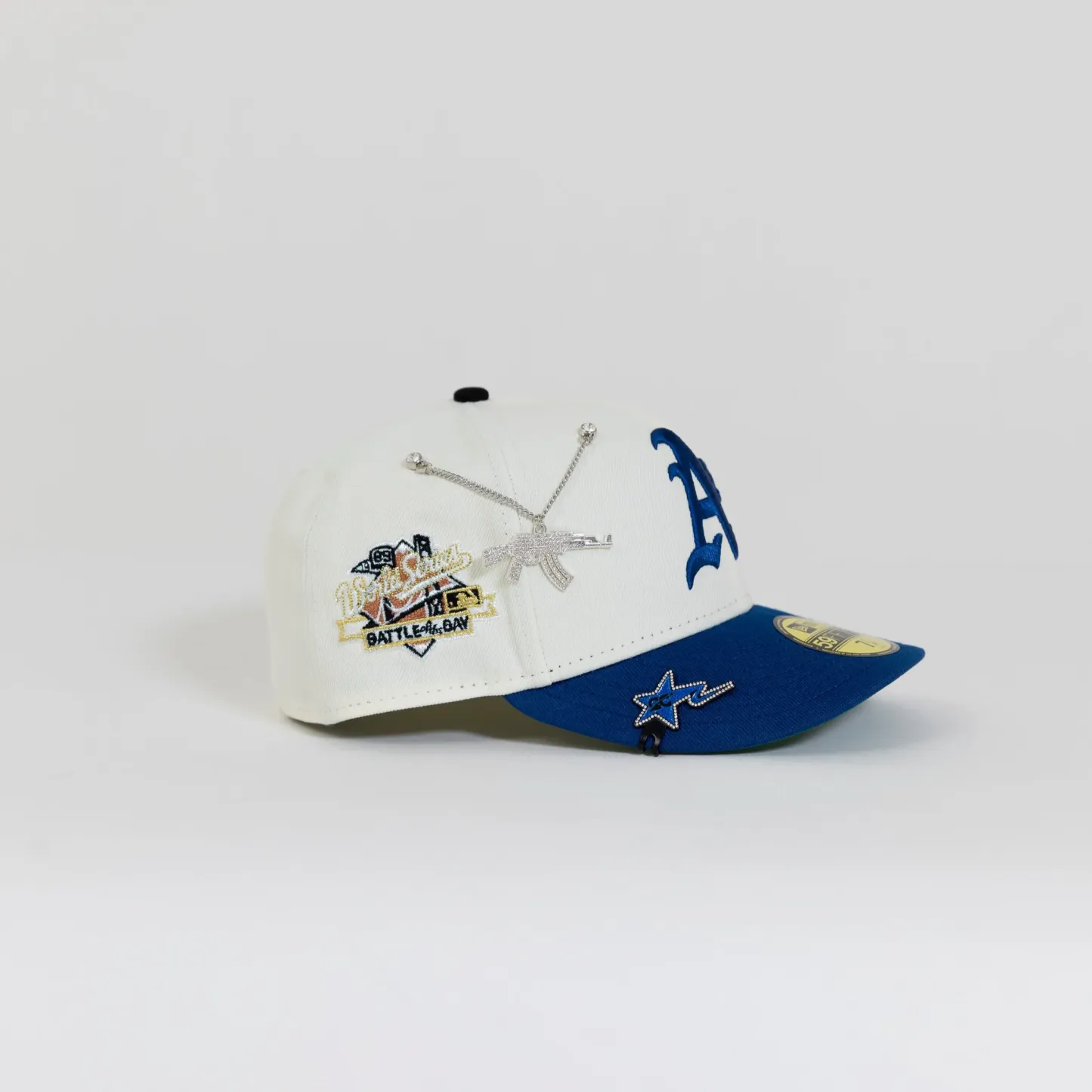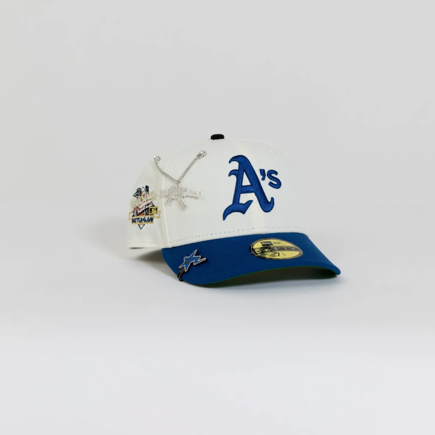 NEW ERA EXCLUSIVE 59FIFTY CHROME/ BLUE OAKLAND ATHLETICS W/ "BATTLE OF THE BAY" SIDE PATCH