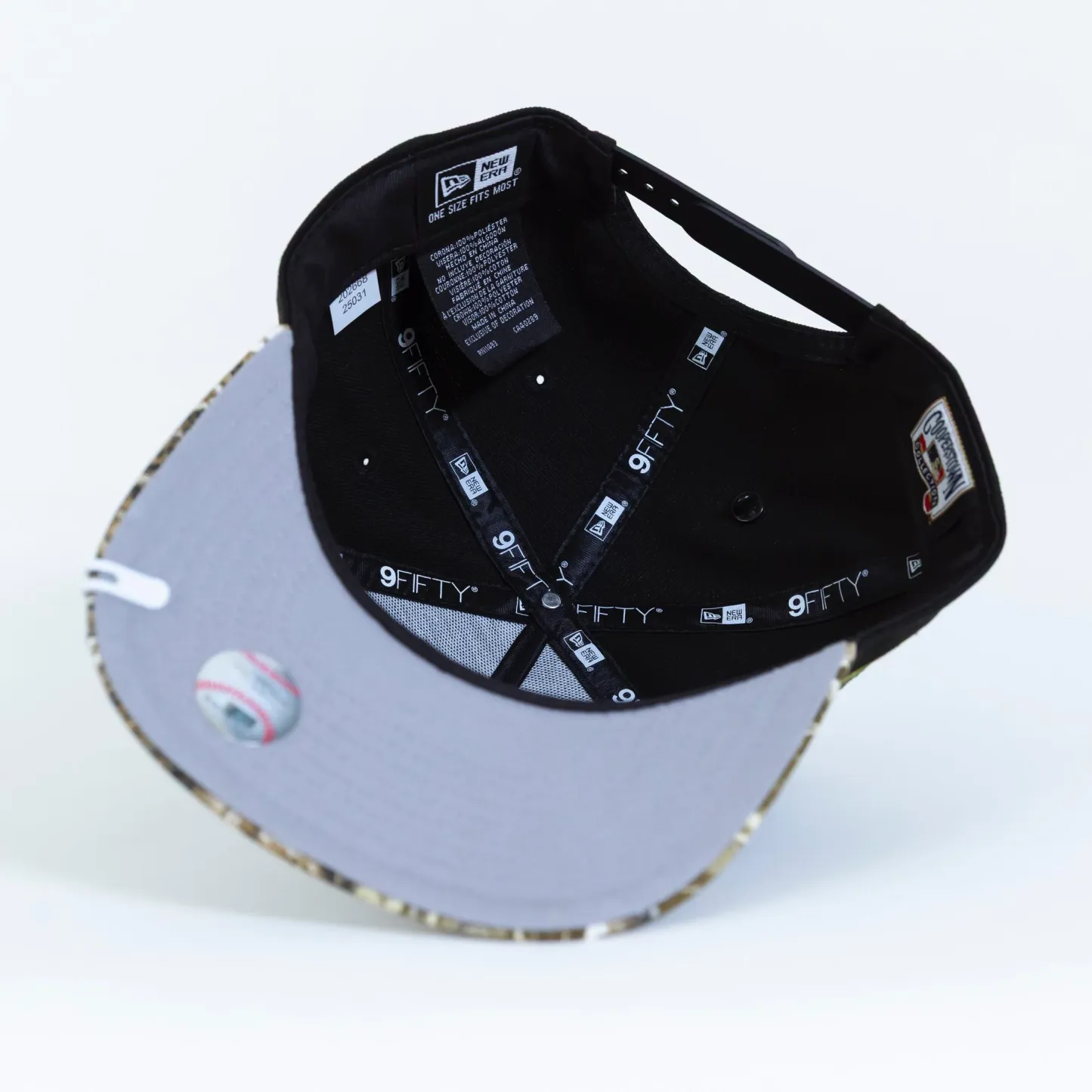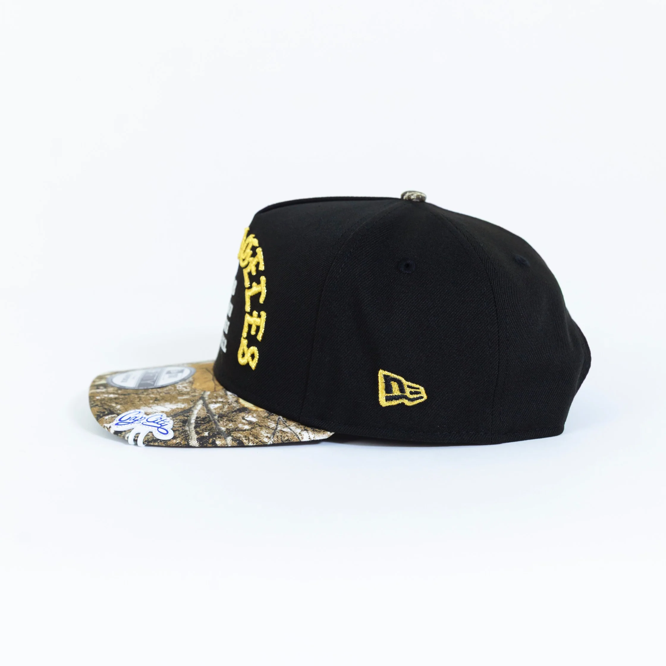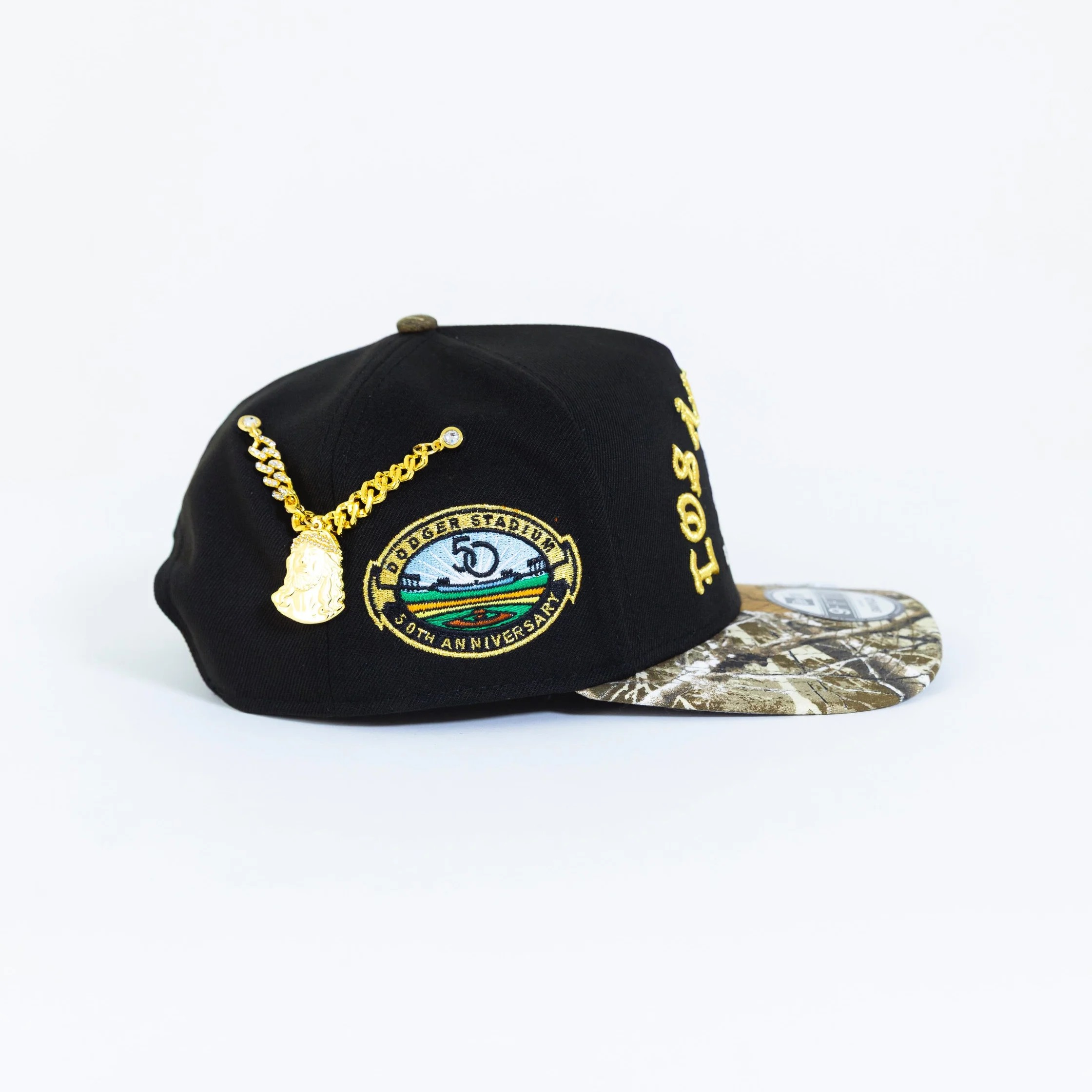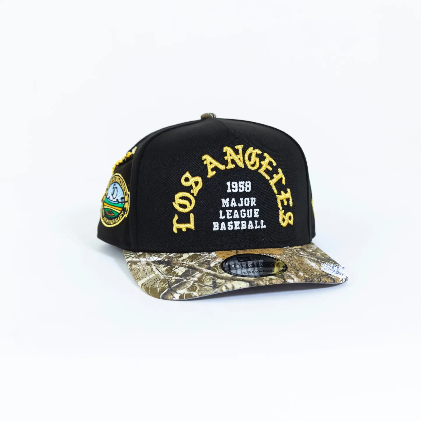 NEW ERA EXCLUSIVE 9FIFTY A-FRAME BLACK/ REALTREE LOS ANGELES DODGERS W/ "1958 MLB SCRIPT" + 50TH ANNIVERSARY SIDE PATCH