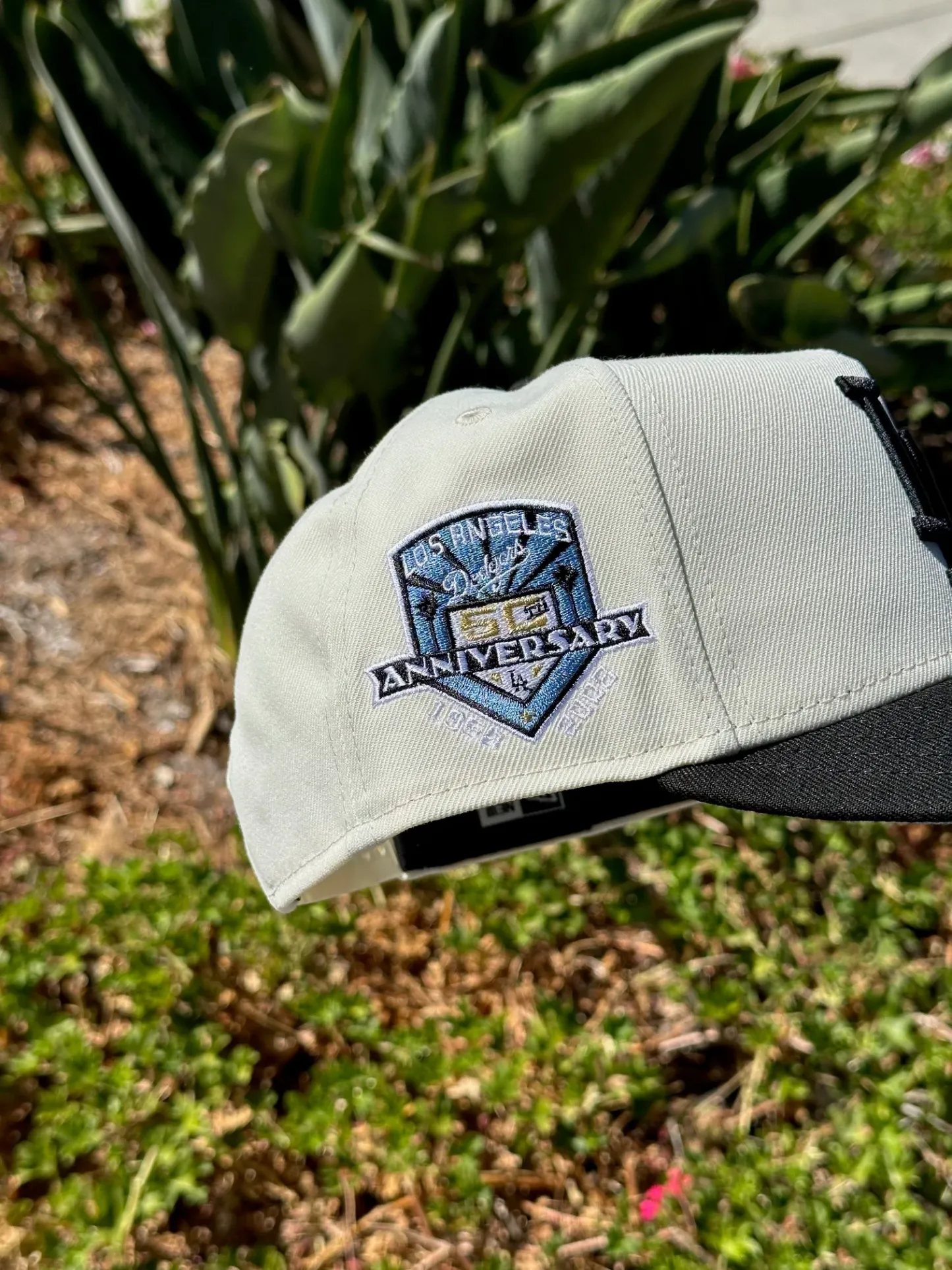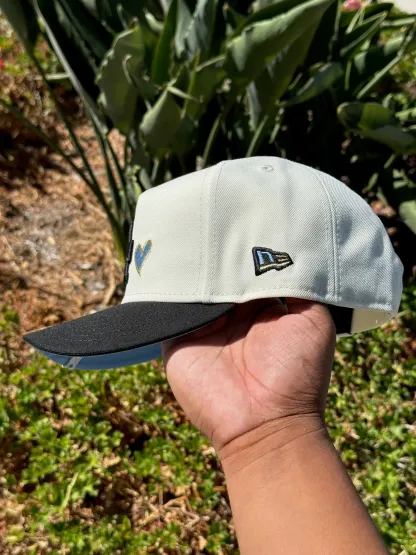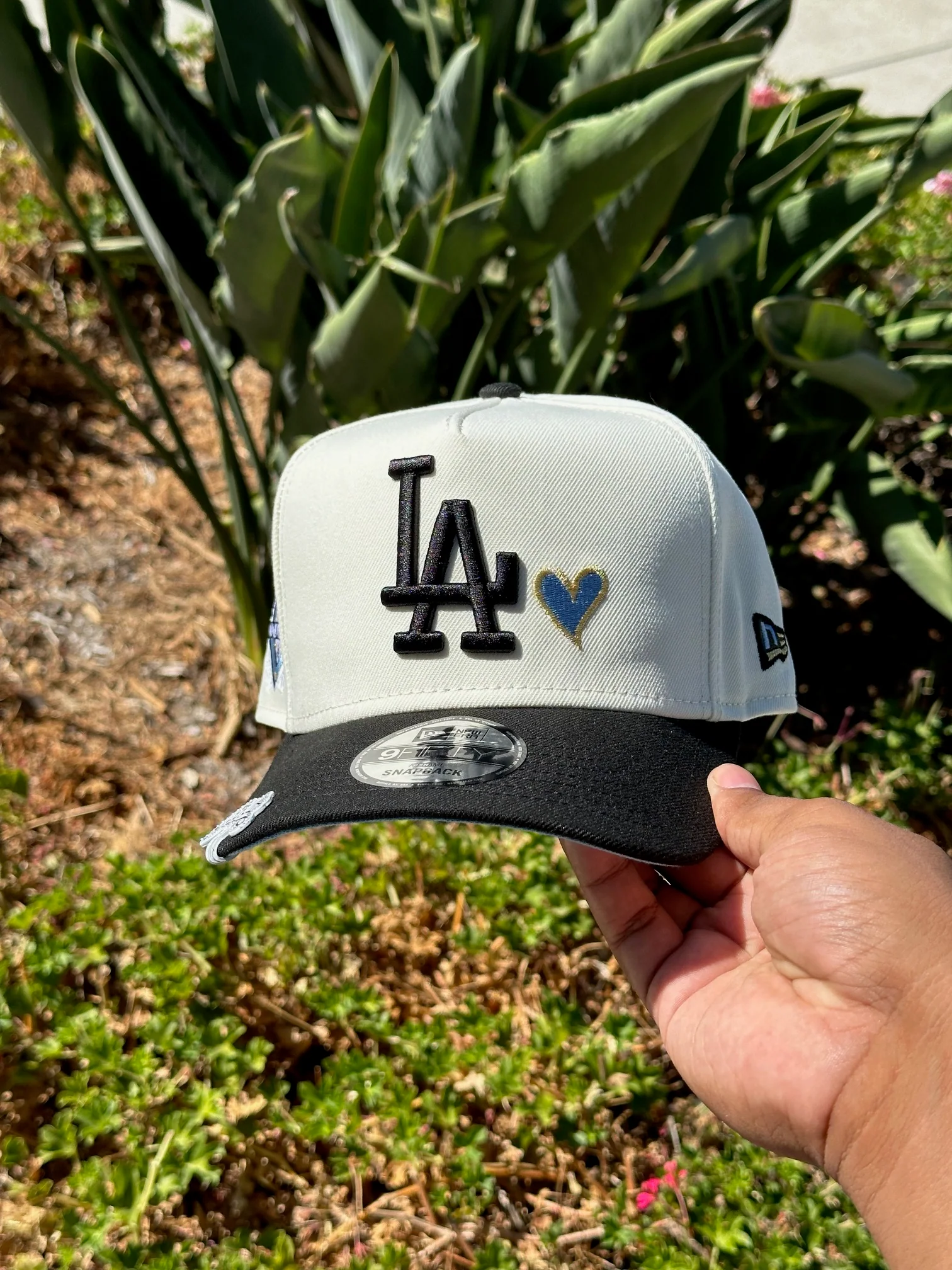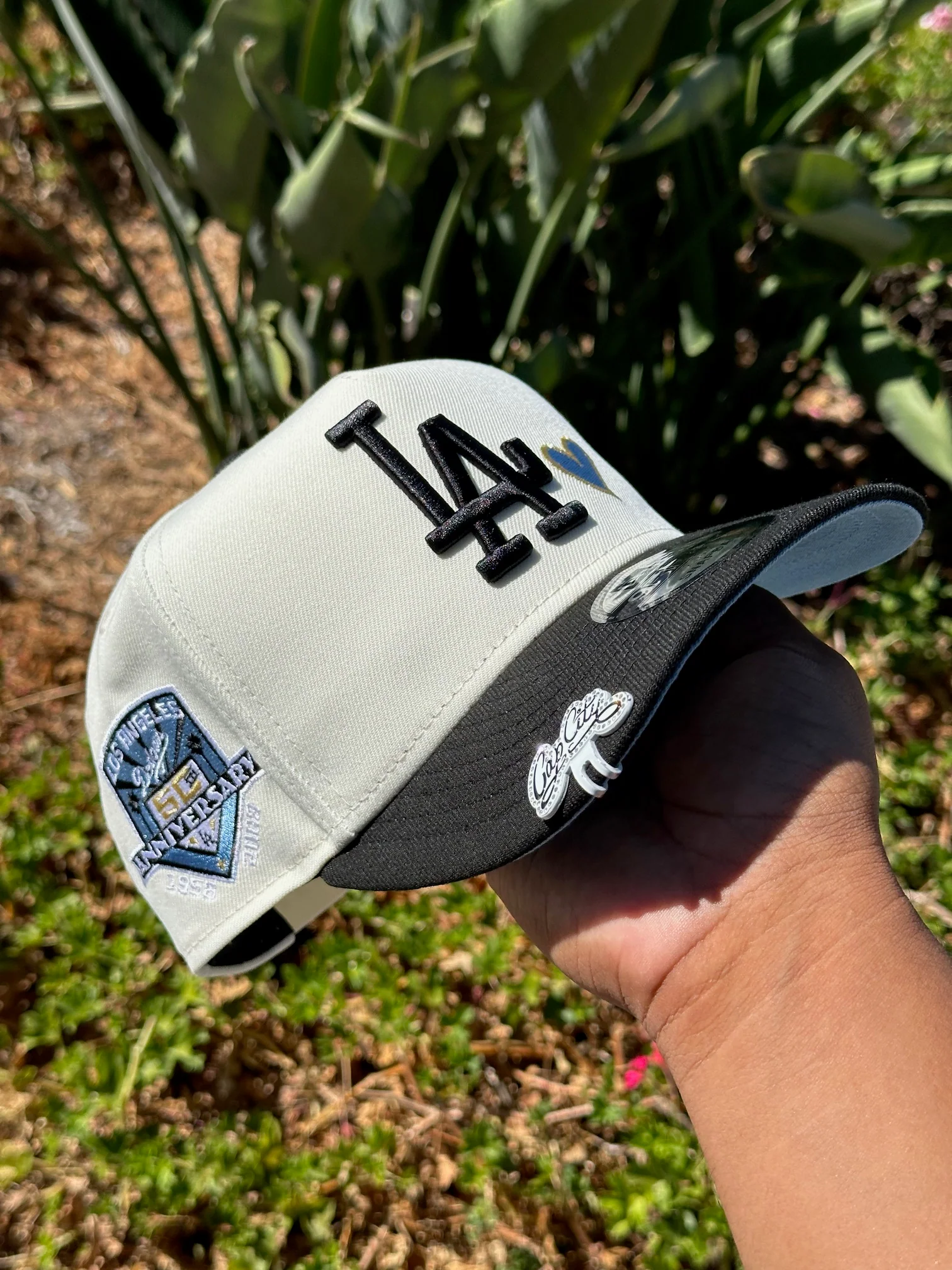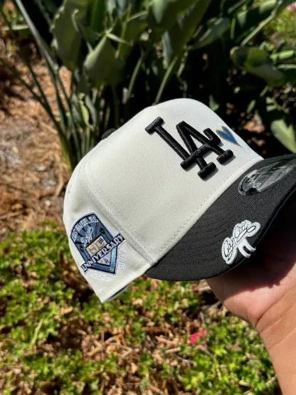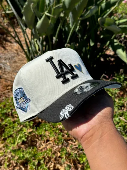 NEW ERA EXCLUSIVE 9FIFTY A-FRAME CHROME WHITE/BLACK LOS ANGELES DODGERS W/ ICY HEART + 50TH ANNIVERSSARY SIDE PATCH