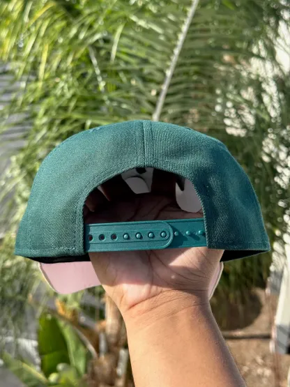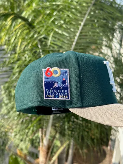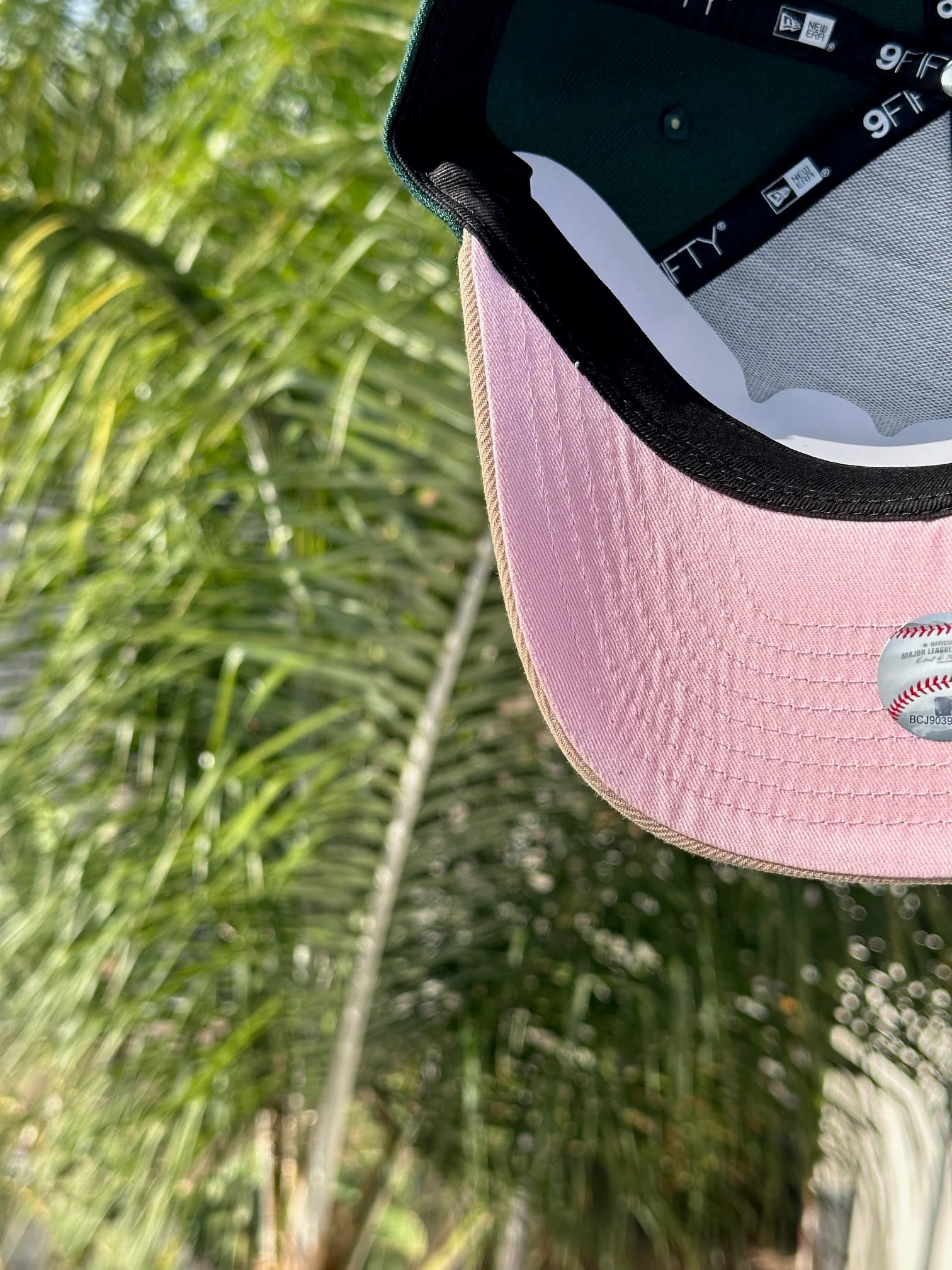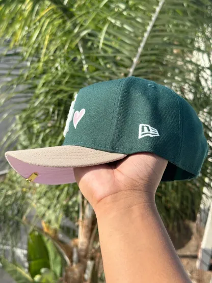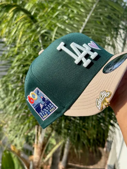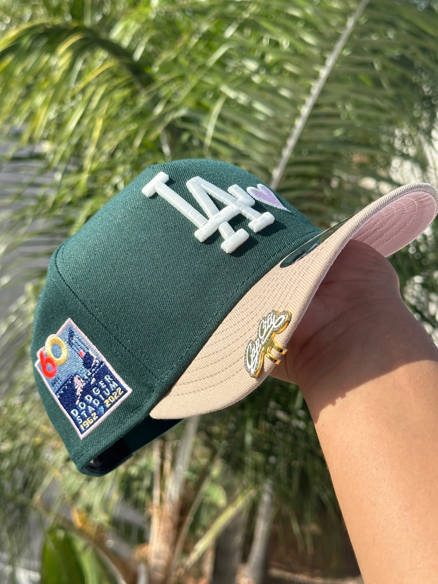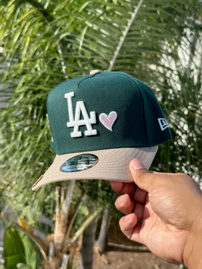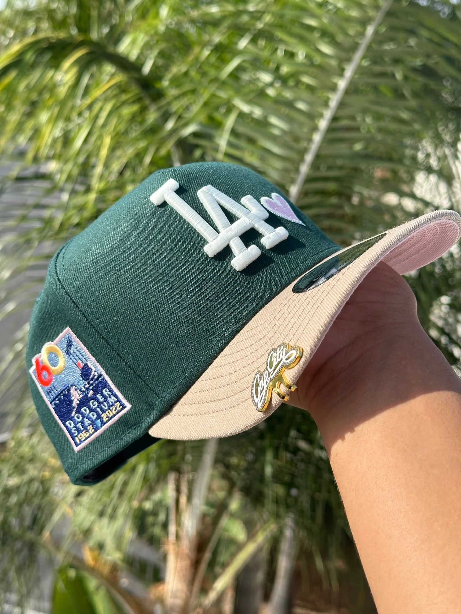 NEW ERA EXCLUSIVE 9FIFTY A-FRAME FOREST GREEN/KHAKI LOS ANGELES DODGERS SNAPBACK W/PINK HEART 60TH ANNIVERSARY SIDE PATCH