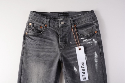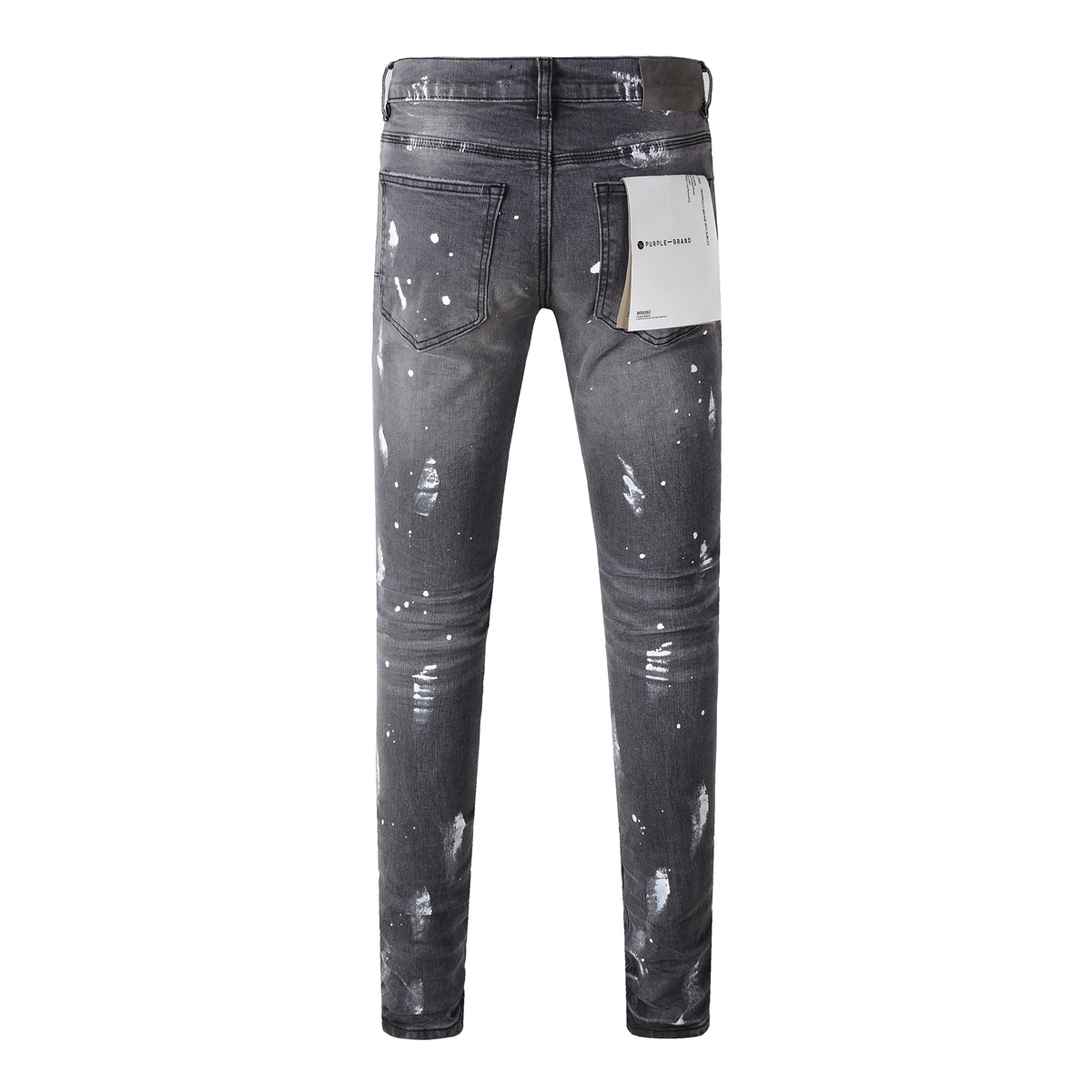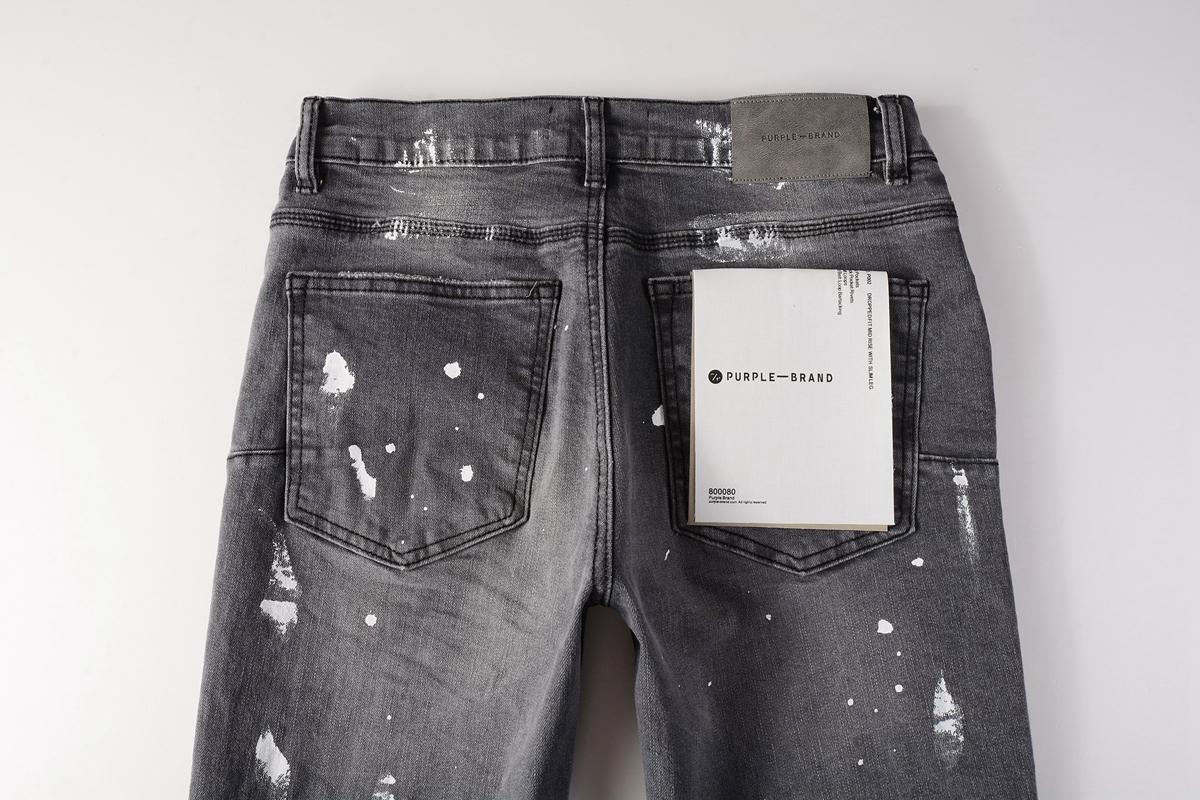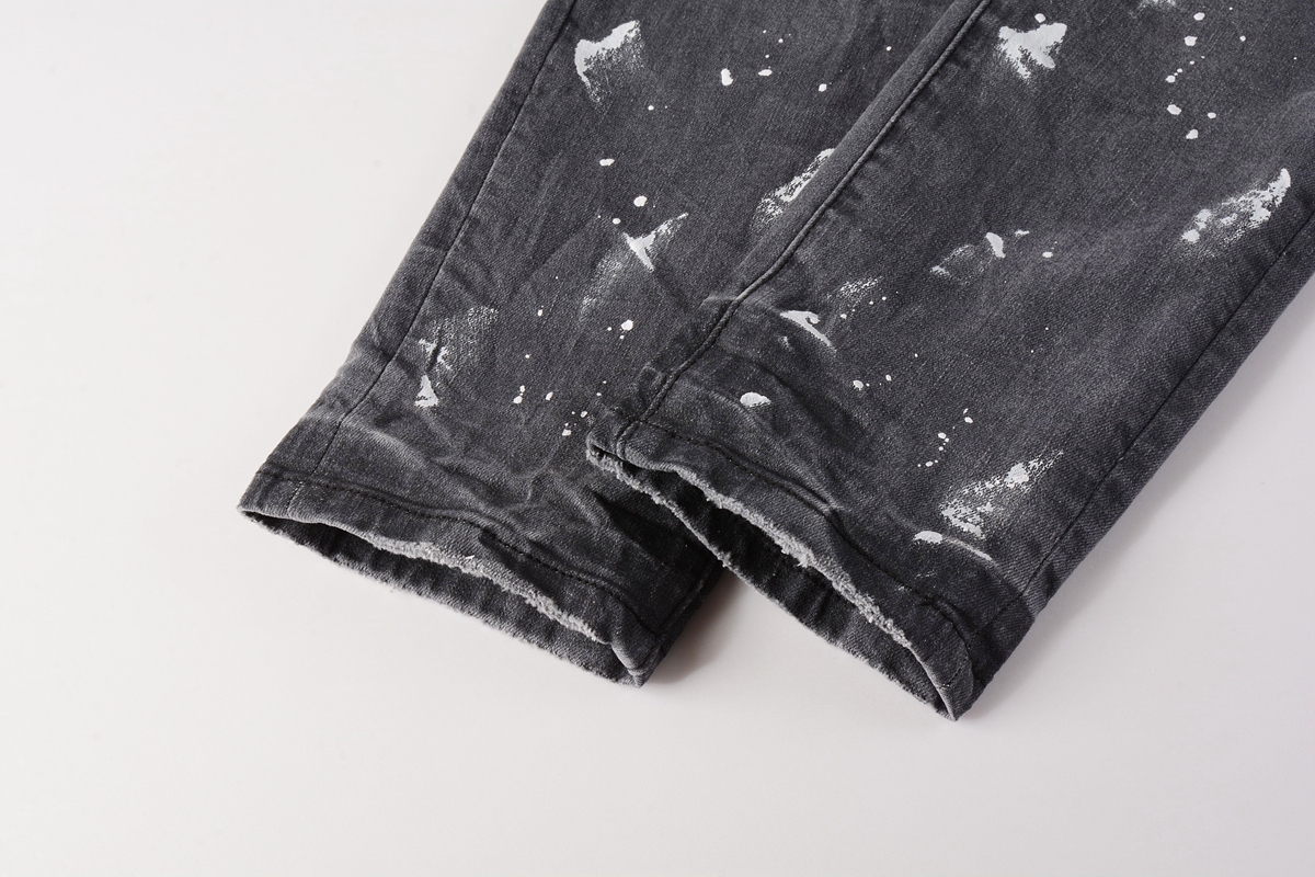 Distressed gray stretch cotton distressed paint splatter slim fit jeans from Purple Brand.