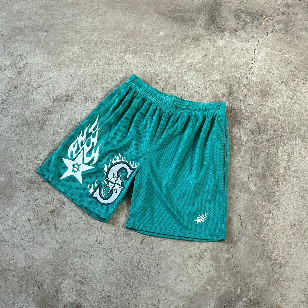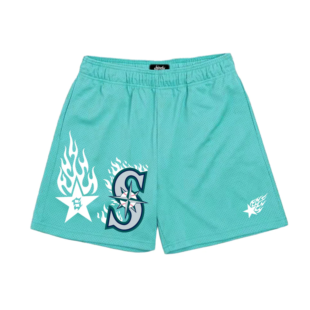 Teal shorts with Seattle flame + SHINOBI® Logo