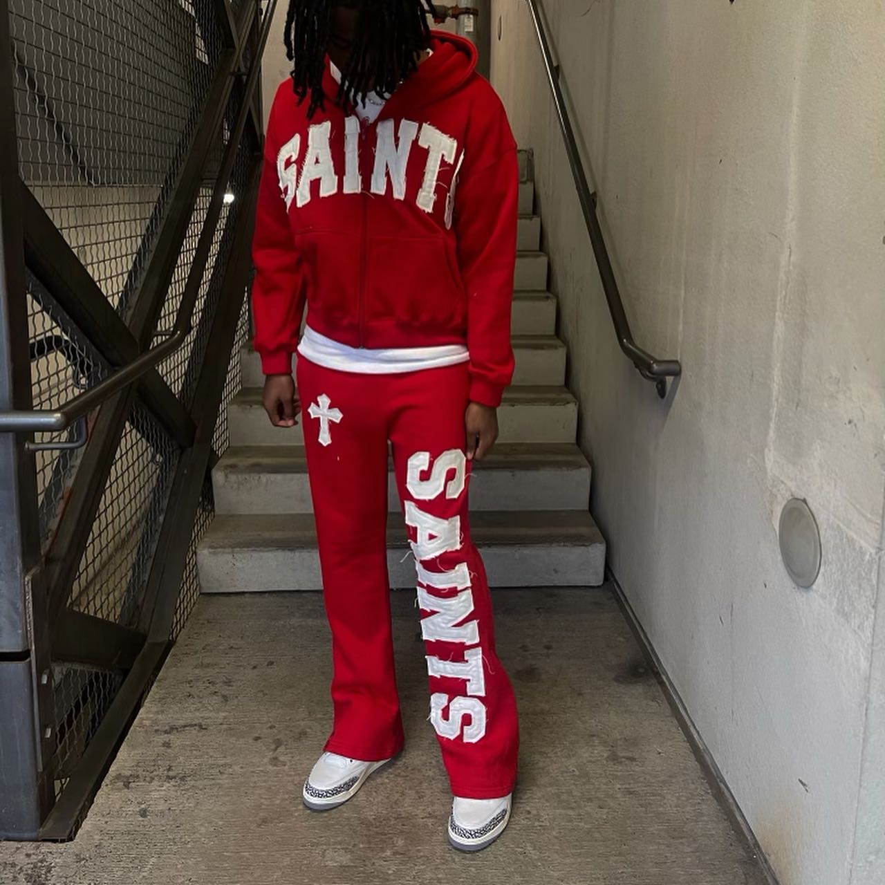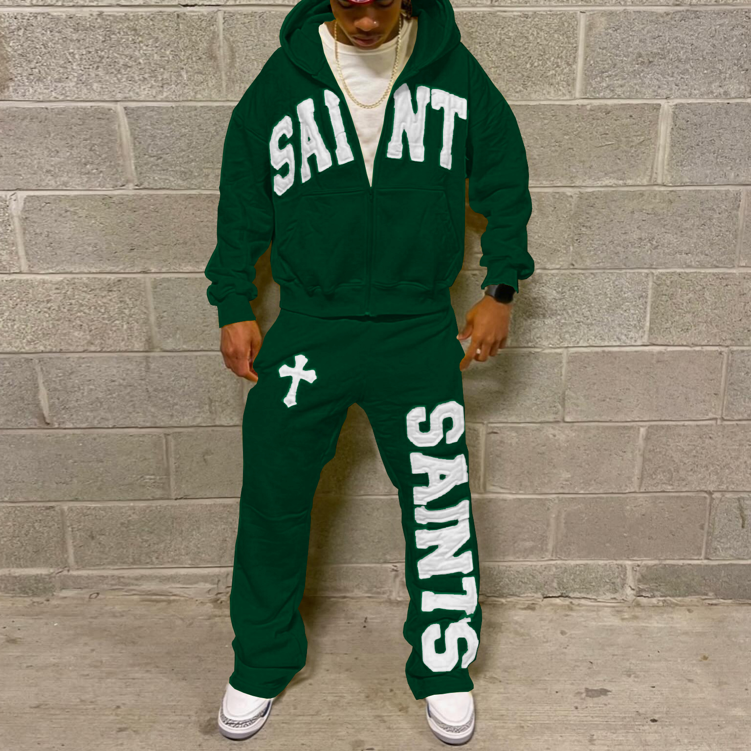 Vintage applique embroidered zip-up sweatshirt two-piece set